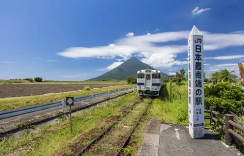 JR日本最南端の駅として知られる西大山駅から正面に望むは開聞岳の景観が自慢。一面に菜の花が咲き乱れる中、開聞岳や池田湖等の名所巡りコースを走るいぶすき菜の花マラソンが大人気です!