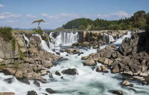 奇岩のそそり立つ曾木の滝は、滝幅210メートル、高さ12メートル。春は桜やつつじが彩り、夏は水量も多く豪快そのもの、秋は銀杏や紅葉が流れの中に鮮やかに浮かび上がり、四季折々に訪れる人を魅了します。