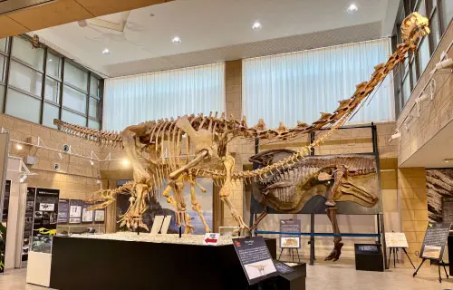 甑島列島の白亜紀後期の地層から二枚貝やアンモナイト、魚類、恐竜やワニ、カメ、植物等の陸や淡水に棲む生き物の化石が沢山見つかっています。当館にはそれらの化石が展示され、1億年前以降の恐竜時代末~哺乳類時代に東アジアに生息していた生き物や当時の環境を学ぶことができます。