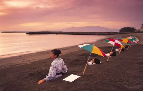 温泉が自然に沸きたつ伏目海岸の砂を掘って横たわり、上から砂をかけ、開聞岳を眺めながら波の音を聞き、温泉熱を全身に浴びる砂浴は天まさに自然のサウナ。後の爽快感がたまらない。