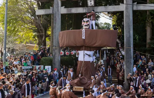 約900年の伝統を持ち、岩川八幡神社で例年11月3日に五穀豊穣を祝い開催される「弥五郎どん祭り」。身の丈4m85㎝、25反もの梅染めの衣をまとった弥五郎どんの先導で、岩川八幡神社を出て市街地を3時間かけて威風堂々と練り歩く「浜下り」が最大の見所です。